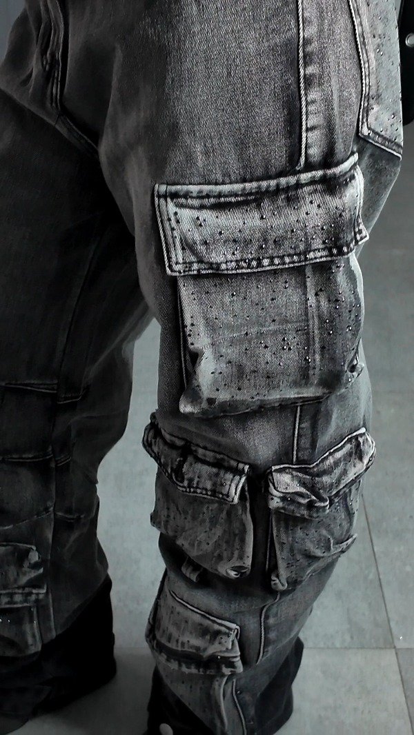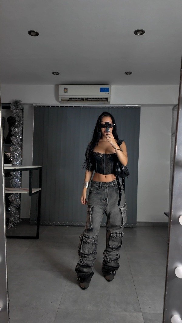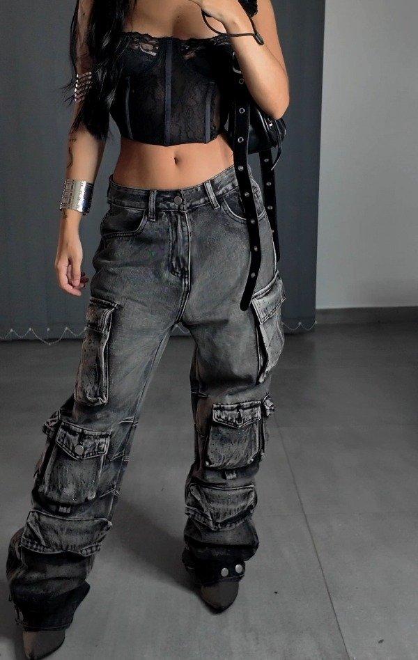 Pant CARGO tiro- Denim rígido, tiro medio.
