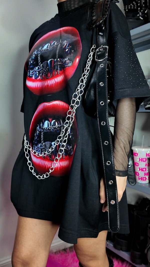 Frente con estampado en DTF de excelente calidad. Con arandelas y cadenas desmontables. Strass en mangas. Espalda completamente lisa.